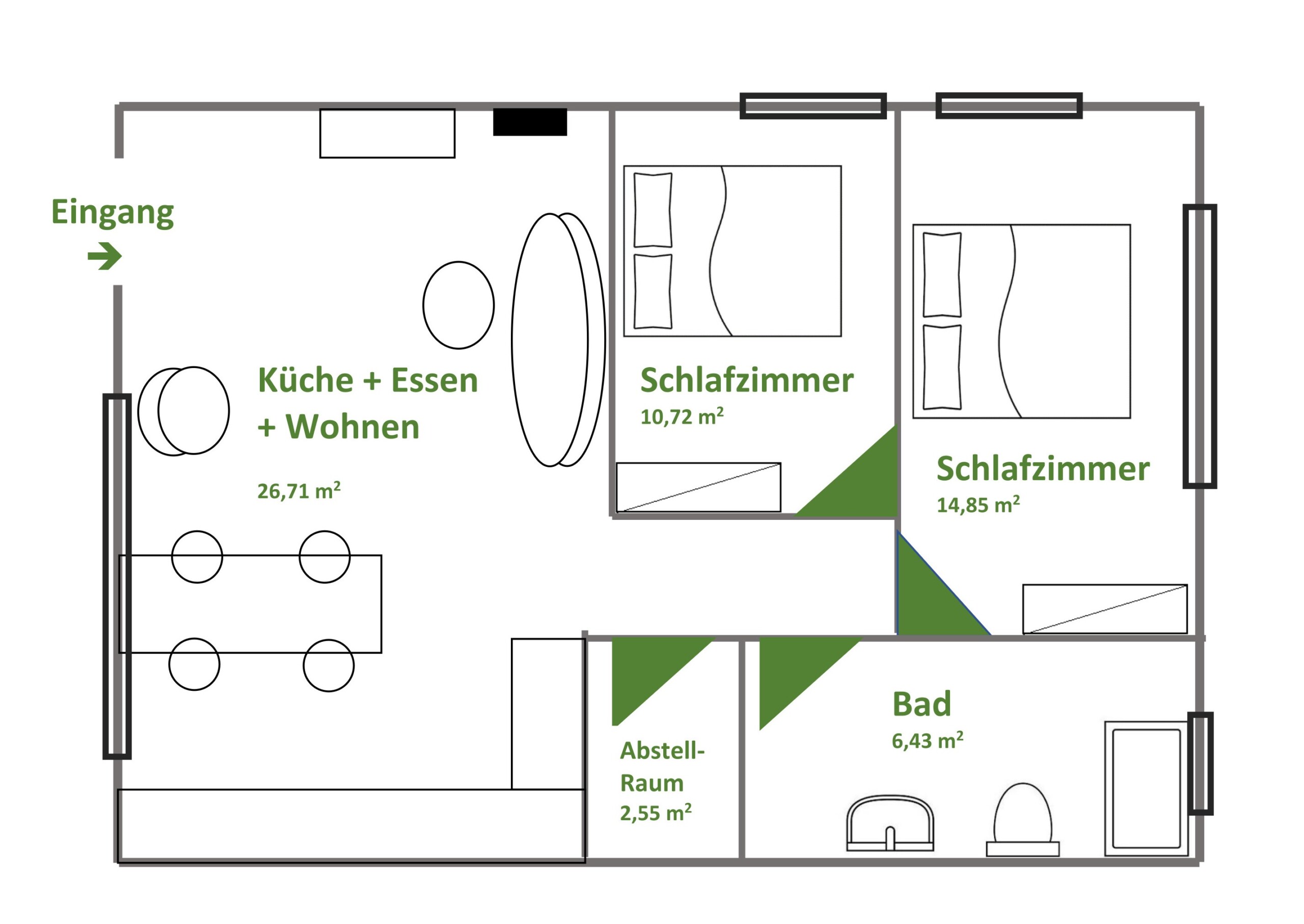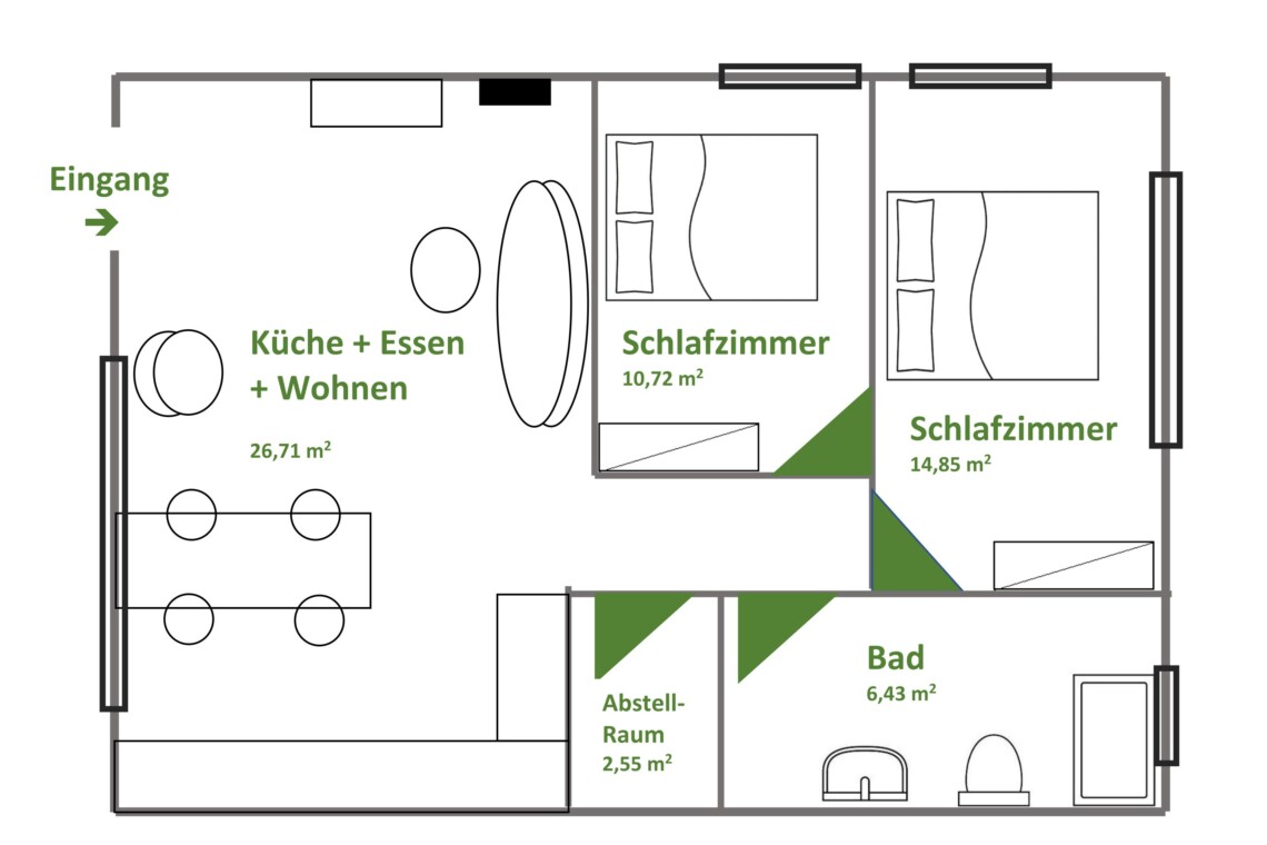 - Zwei separate Schlafzimmer mit hochwertigen Betten (1 × 2,00 m und 1 × 1,80 m)