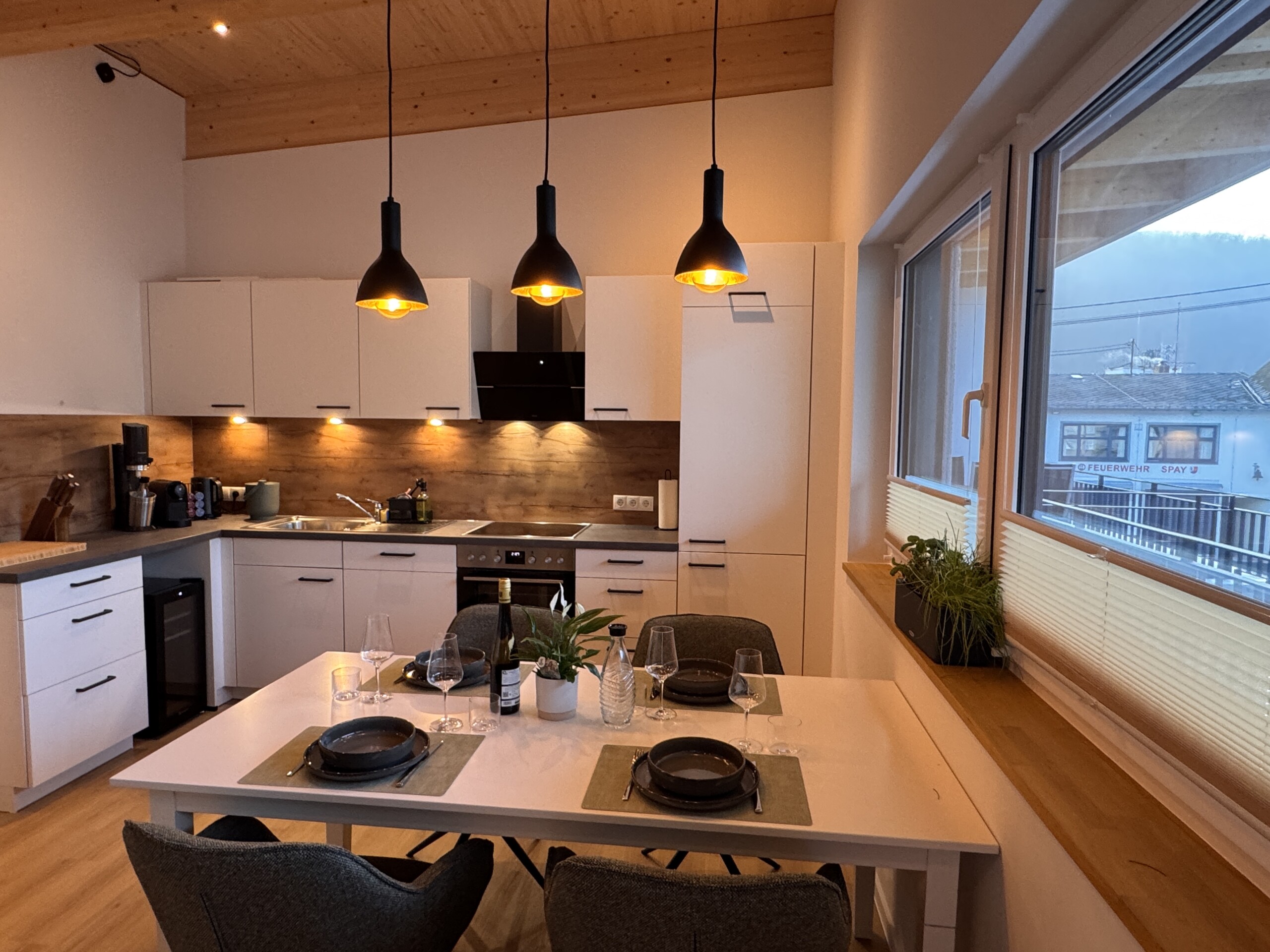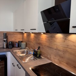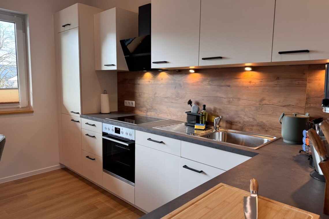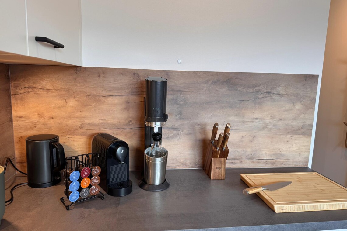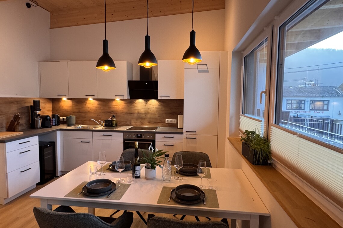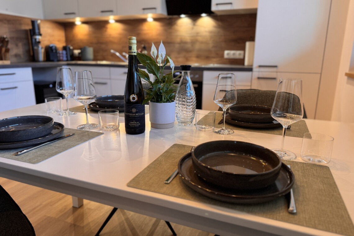 Die Küche ist vollständig ausgestattet und lädt zum gemeinsamen Kochen, Genießen und Verweilen ein. Kleine Annehmlichkeiten wie Kaffee, Tee, Gewürze sowie eine feine Auswahl unserer Weine und Sekte im Weinkühlschrank machen Ihren Aufenthalt besonders entspannt. Ob Frühstück in aller Ruhe oder ein genussvoller Abend mit einem Glas Riesling – hier darf Genuss ganz selbstverständlich sein.
