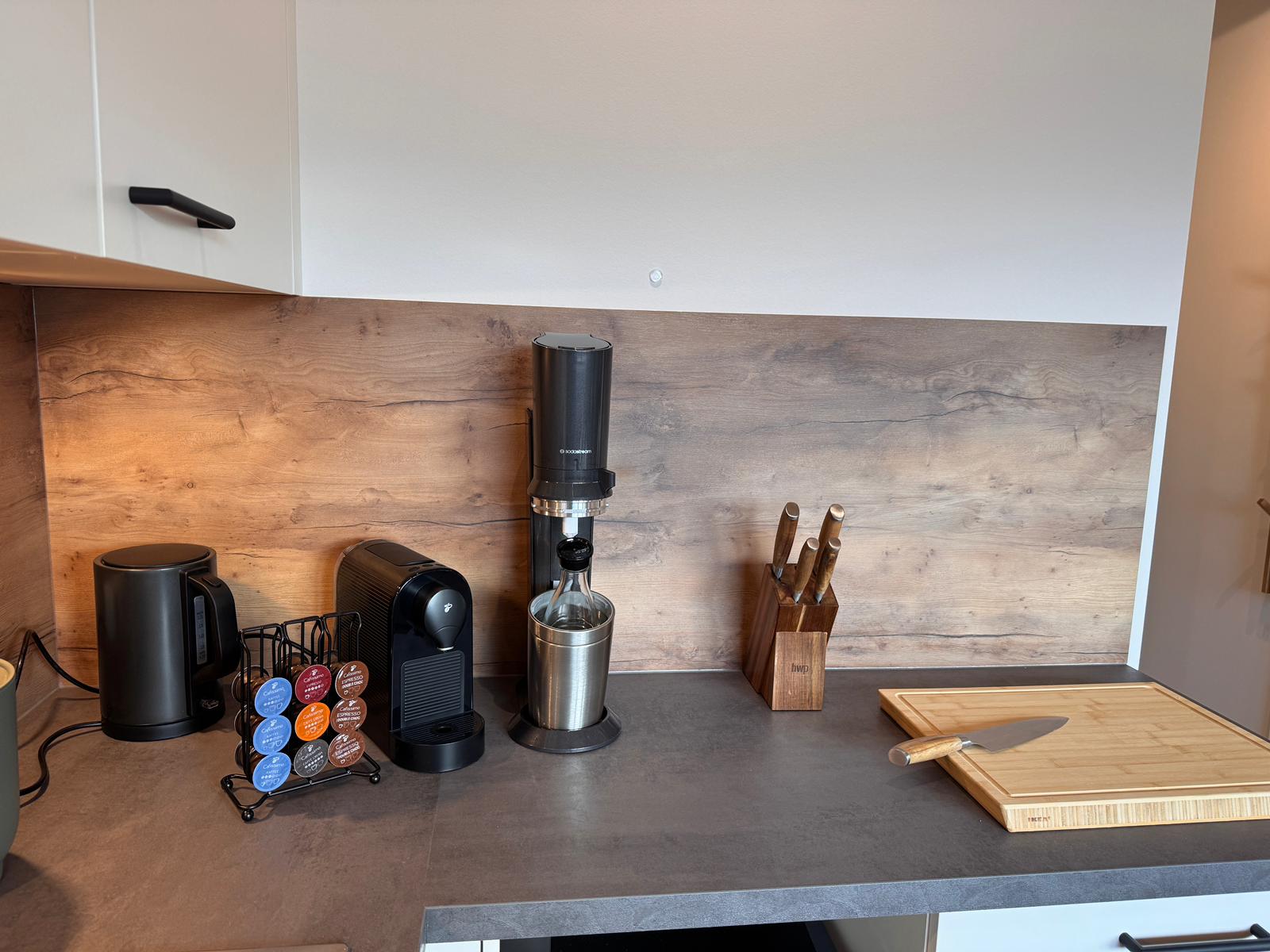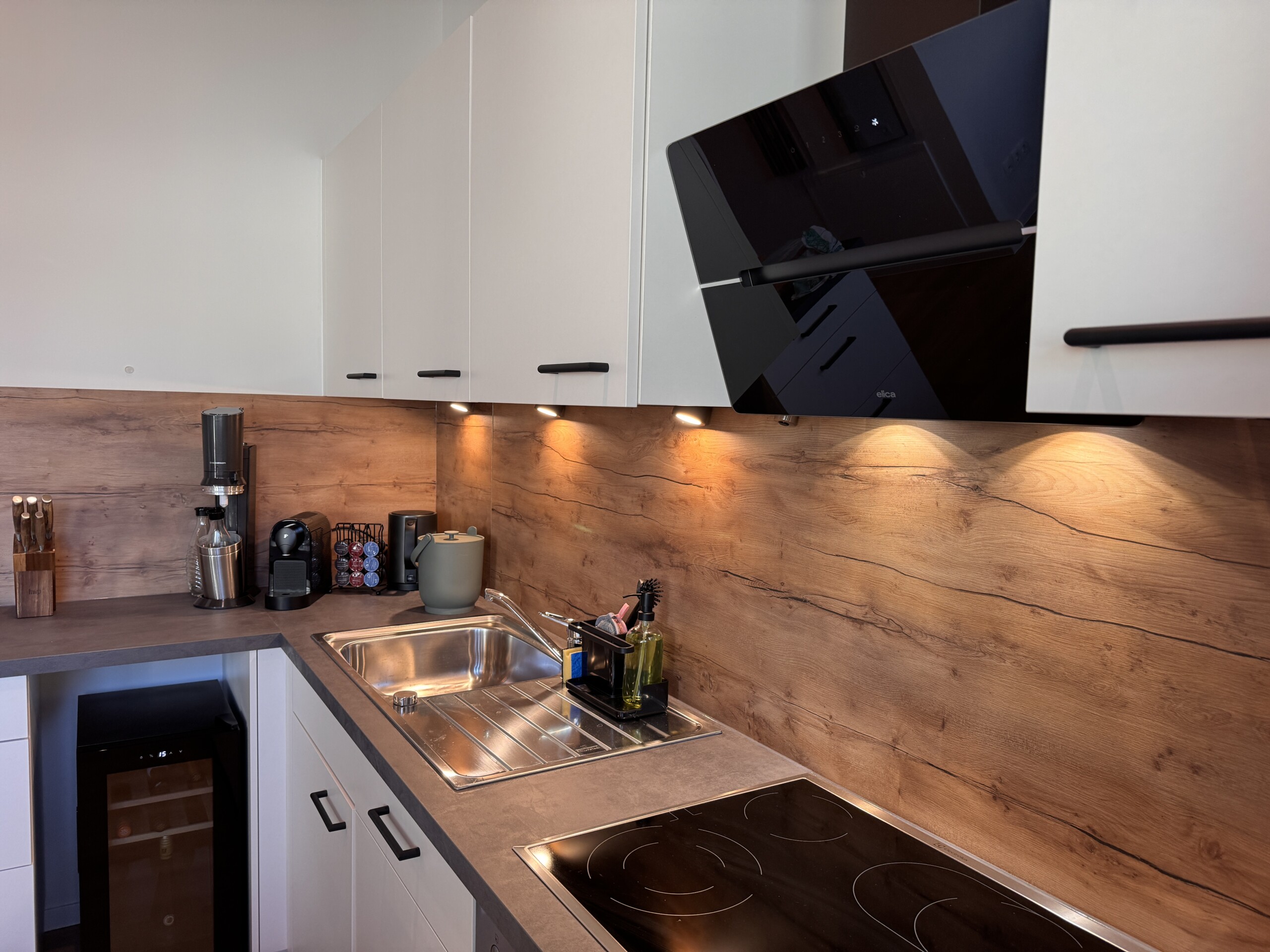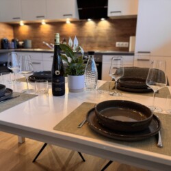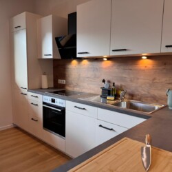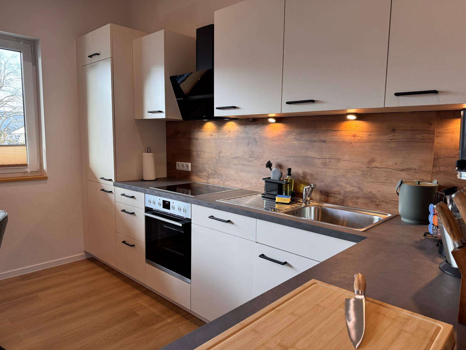 Die Küche ist vollständig ausgestattet und lädt zum gemeinsamen Kochen, Genießen und Verweilen ein. Kleine Annehmlichkeiten wie Kaffee, Tee, Gewürze sowie eine feine Auswahl unserer Weine und Sekte im Weinkühlschrank machen Ihren Aufenthalt besonders entspannt. Ob Frühstück in aller Ruhe oder ein genussvoller Abend mit einem Glas Riesling – hier darf Genuss ganz selbstverständlich sein.