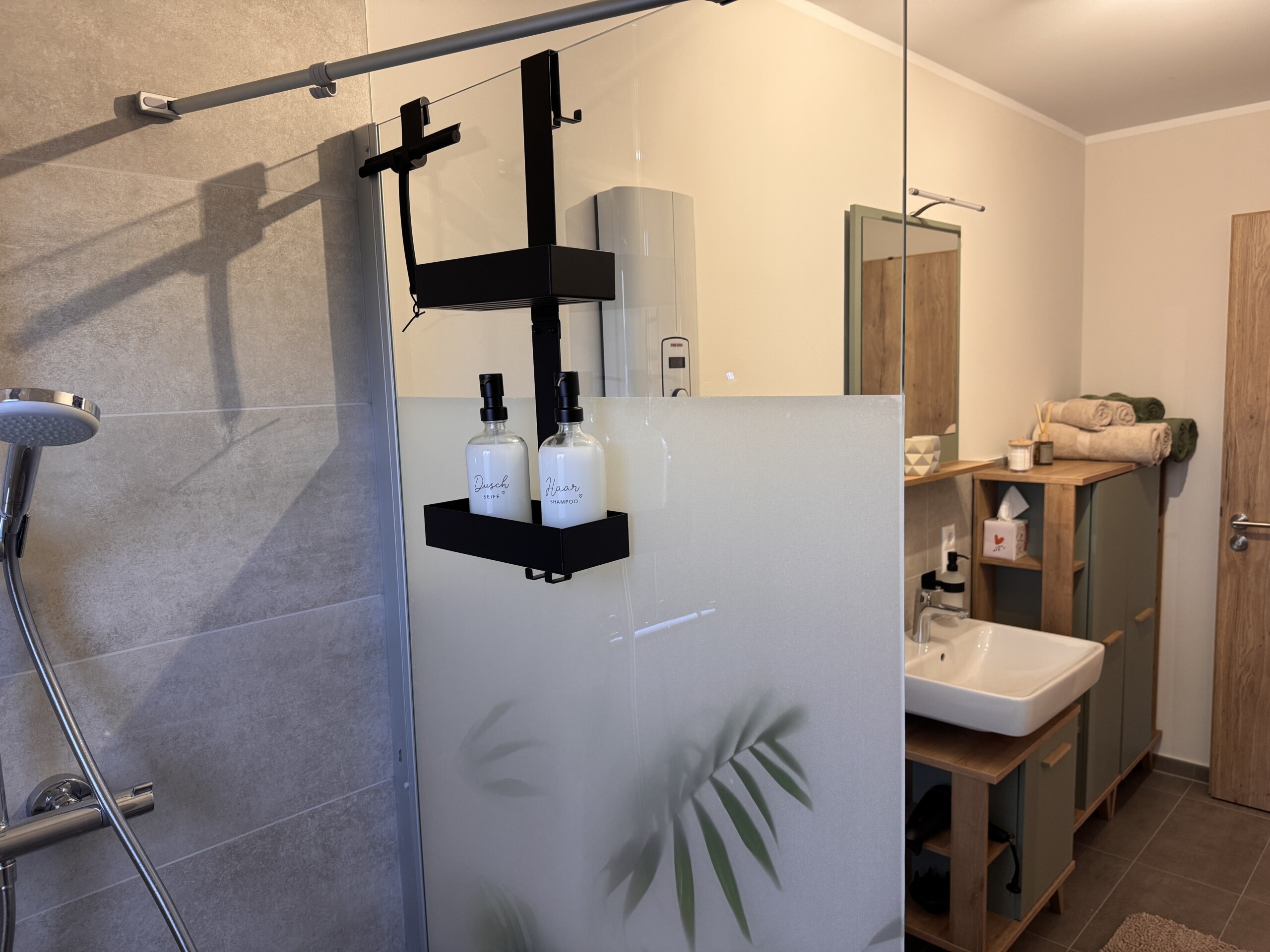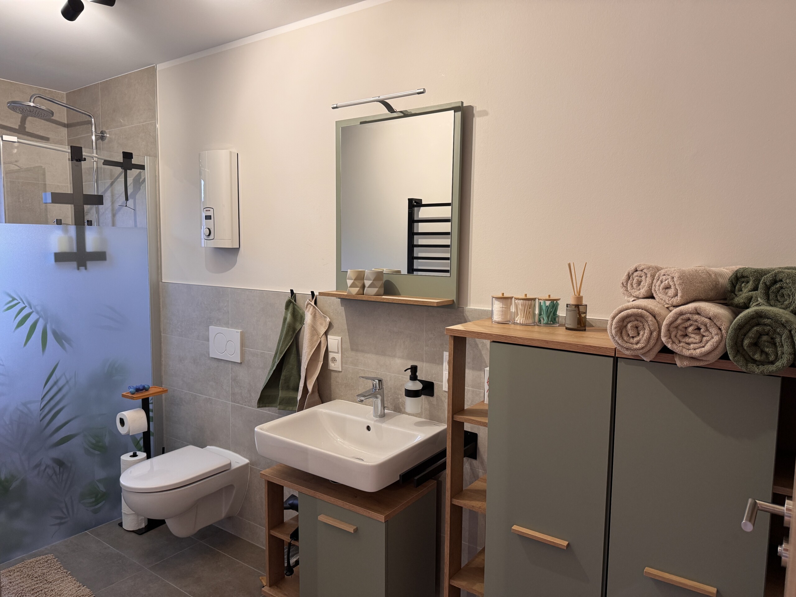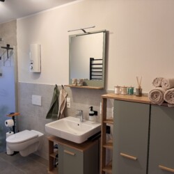 Im Bad erwartet Sie ein Ort zum Durchatmen und Erfrischen. Eine großzügige Regendusche, flauschige Handtücher und ausgewählte Pflegeprodukte sorgen für einen angenehmen Start in den Tag oder einen entspannten Ausklang am Abend. Kleine Details und eine hochwertige Ausstattung machen auch diesen Raum zu einem Teil Ihres Wohlfühlaufenthalts