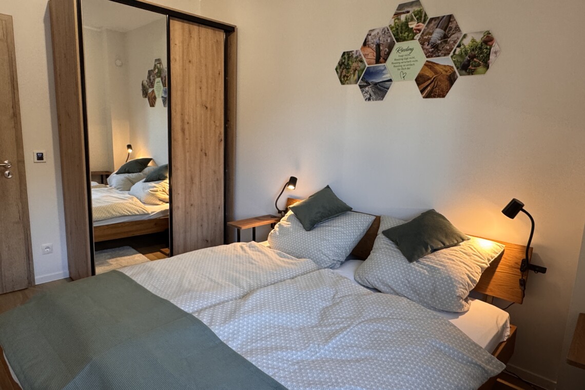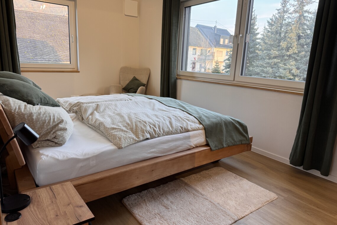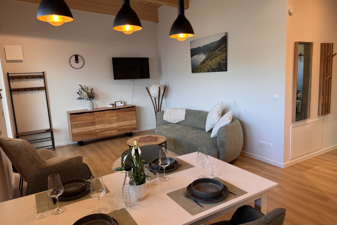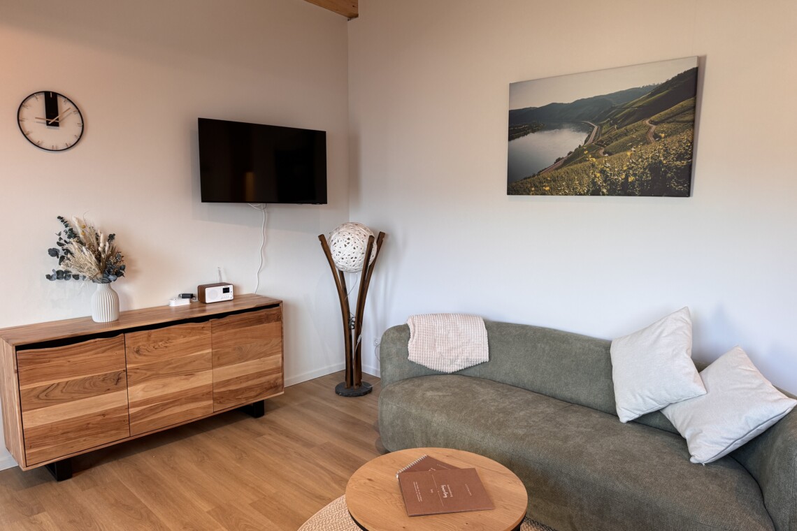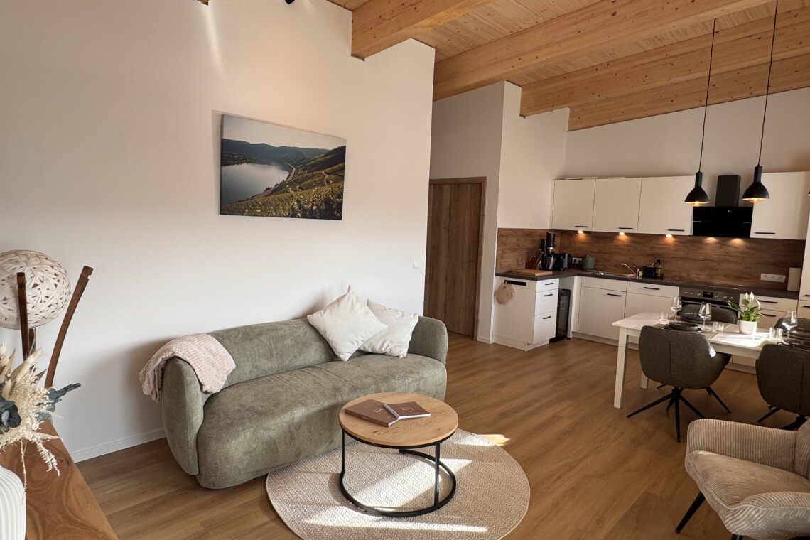Unsere Ferienwohnungen sind Rückzugsorte zum Ankommen und Entspannen. Hochwertige Materialien, durchdachte Raumaufteilung und eine warme Atmosphäre sorgen dafür, dass Sie sich vom ersten Moment an auf den 62 qm wohlfühlen. Ob ruhiger Schlaf nach einem aktiven Tag oder gemütliche Stunden im Wohnbereich – genießen Sie Komfort, Ruhe und Raum für Ihre Auszeit am Mittelrhein.