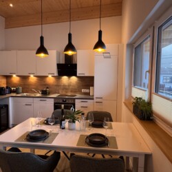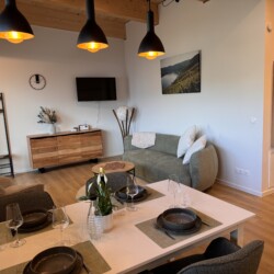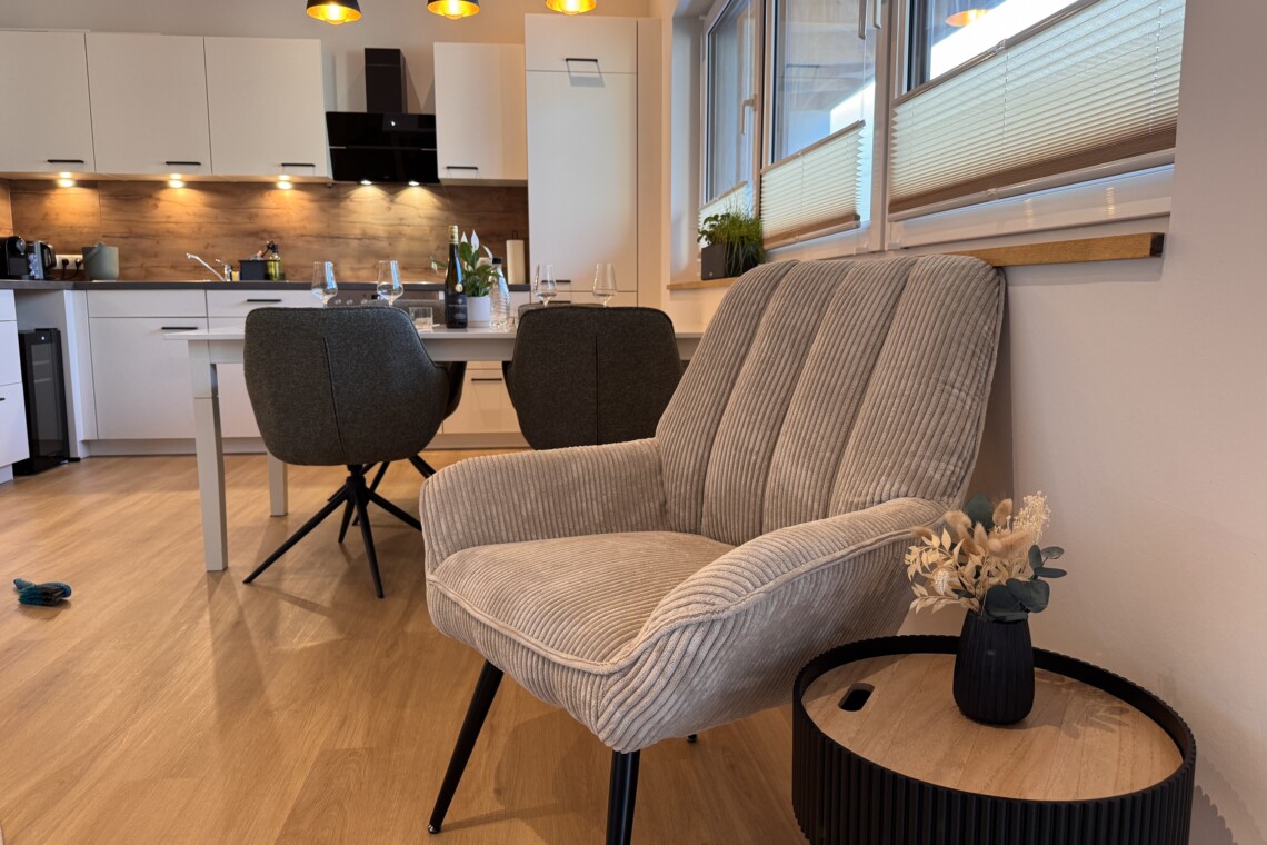 Der Wohn- und Essbereich ist großzügig gestaltet und lädt zum Ankommen, Zusammensitzen und Entspannen ein. Ein großer Esstisch, bequeme Sitzgelegenheiten sowie Sofa und Sessel schaffen Raum für gemeinsame Mahlzeiten und gemütliche Abende. Bücher, Spiele, TV und Musik begleiten entspannte Stunden – ein Ort, an dem sich Alltag ganz leicht in Urlaub verwandelt.