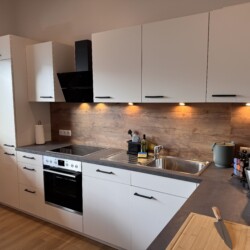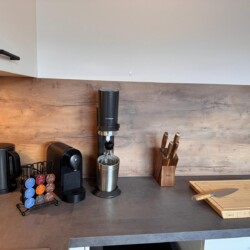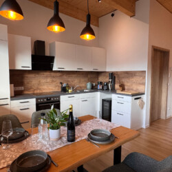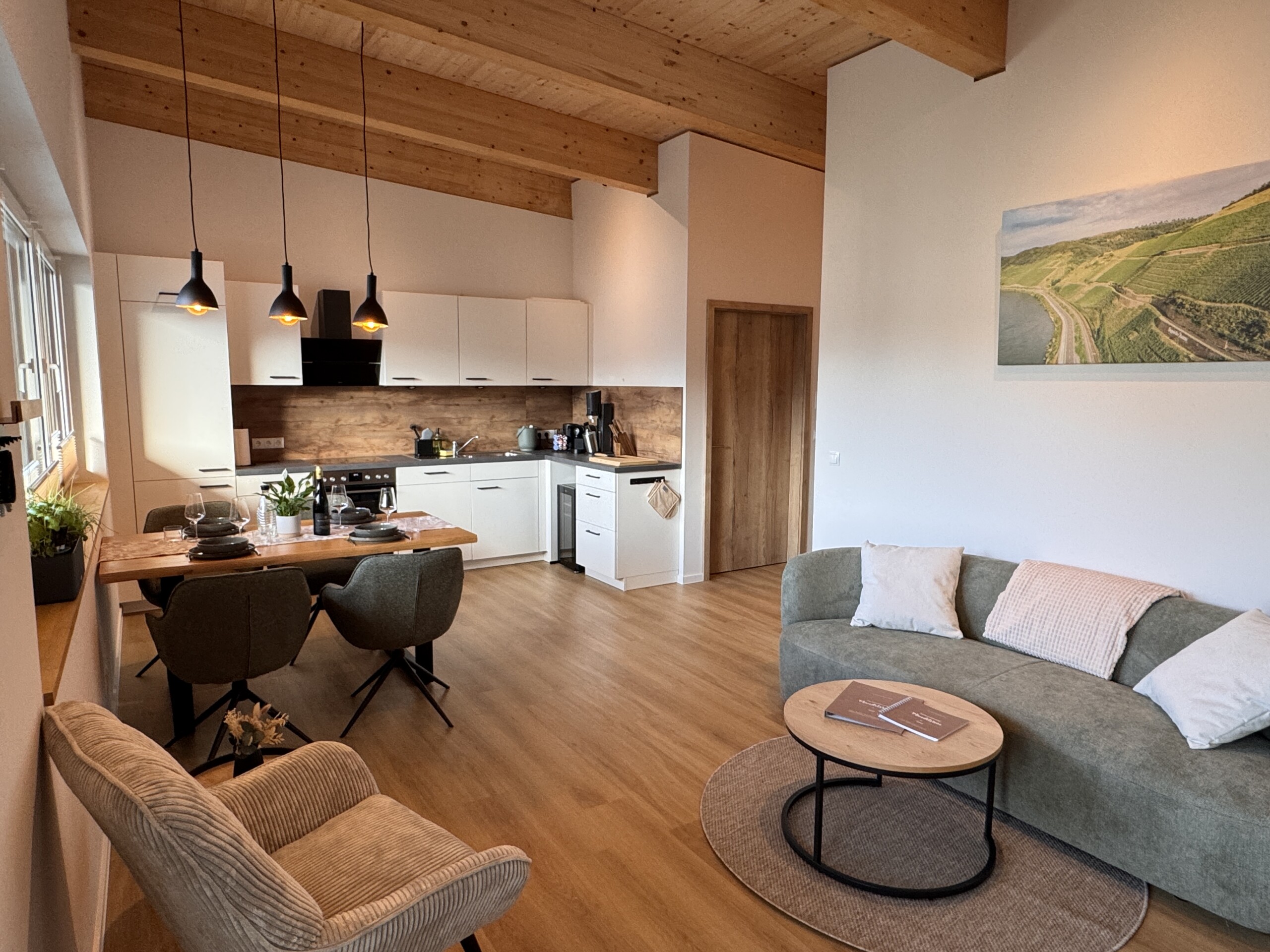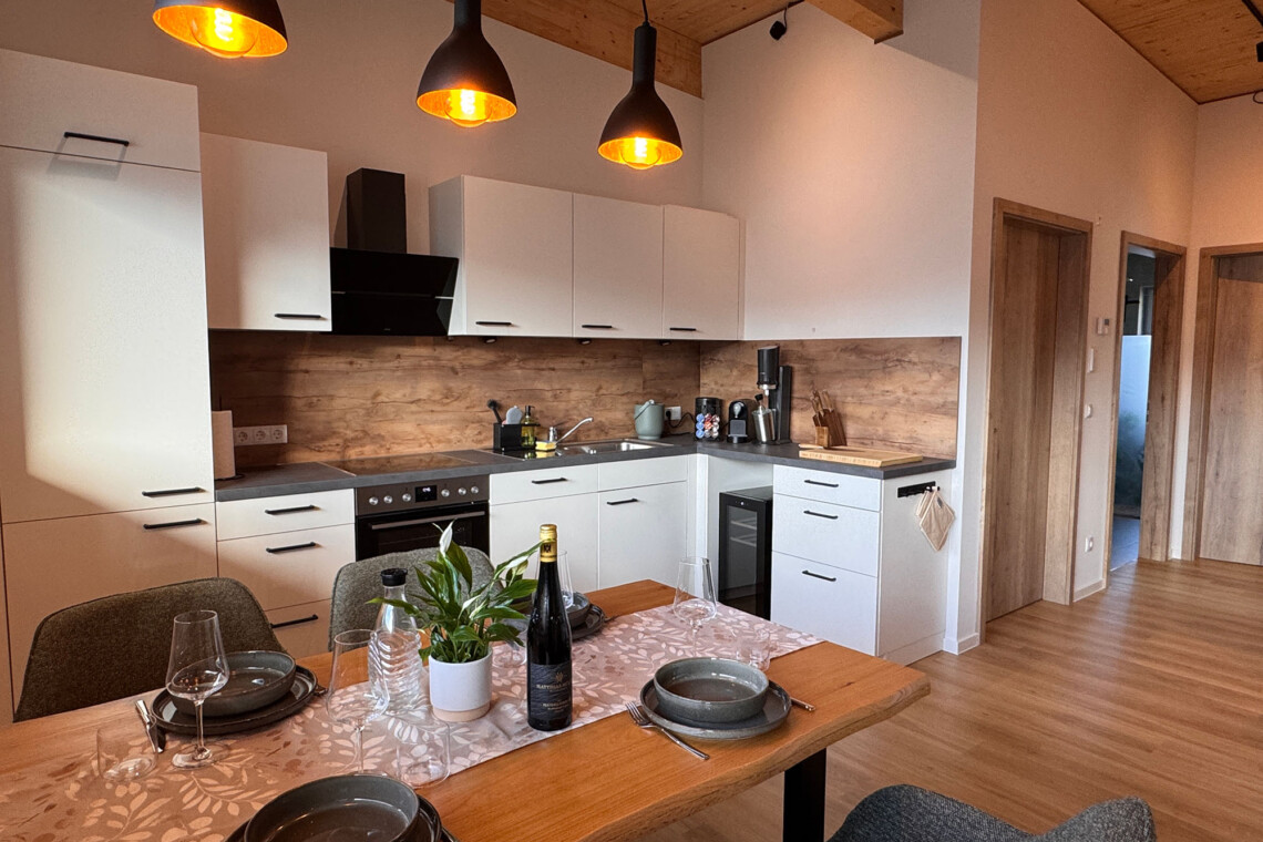 Die Küche ist vollständig ausgestattet und lädt zum gemeinsamen Kochen, Genießen und Verweilen ein. Kleine Annehmlichkeiten wie Kaffee, Tee, Gewürze sowie eine feine Auswahl unserer Weine und Sekte im Weinkühlschrank machen Ihren Aufenthalt besonders entspannt. Ob Frühstück in aller Ruhe oder ein genussvoller Abend mit einem Glas Riesling – hier darf Genuss ganz selbstverständlich sein.