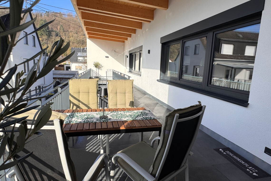 Der großzügige Balkon mit rund 18 m² erweitert den Wohnraum nach draußen und lädt zum Verweilen an der frischen Luft ein. Ein Esstisch (ausziehbar) mit bequemen Stühlen, Sitzauflagen und stimmungsvoller Beleuchtung schafft den perfekten Rahmen für Frühstück, entspannte Stunden oder ein Glas Wein am Abend.