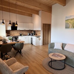 Der Wohn- und Essbereich ist großzügig gestaltet und lädt zum Ankommen, Zusammensitzen und Entspannen ein. Ein großer Esstisch, bequeme Sitzgelegenheiten sowie Sofa und Sessel schaffen Raum für gemeinsame Mahlzeiten und gemütliche Abende. Bücher, Spiele, TV und Musik begleiten entspannte Stunden – ein Ort, an dem sich Alltag ganz leicht in Urlaub verwandelt.