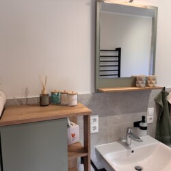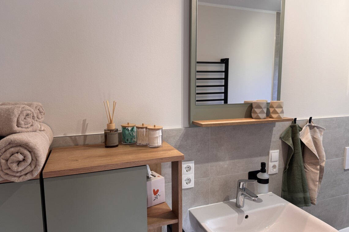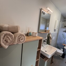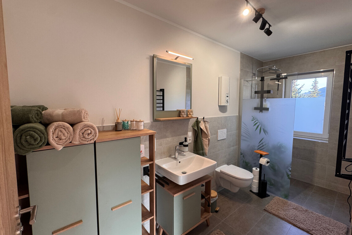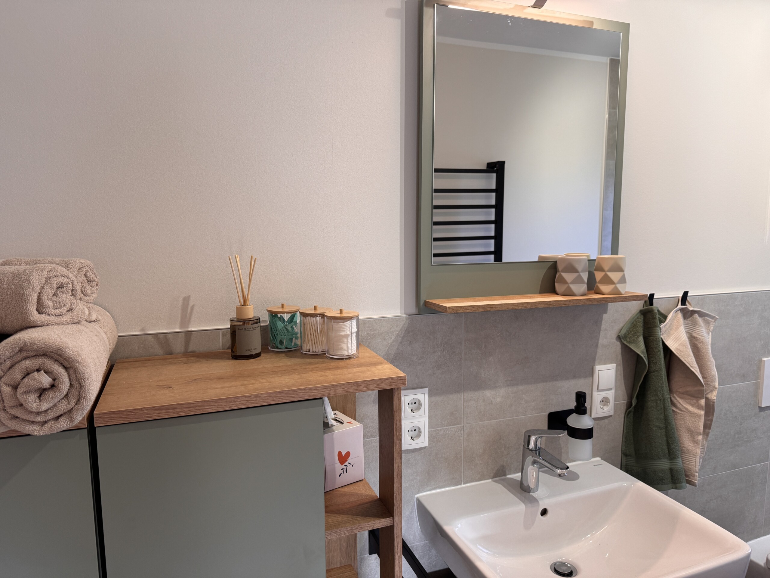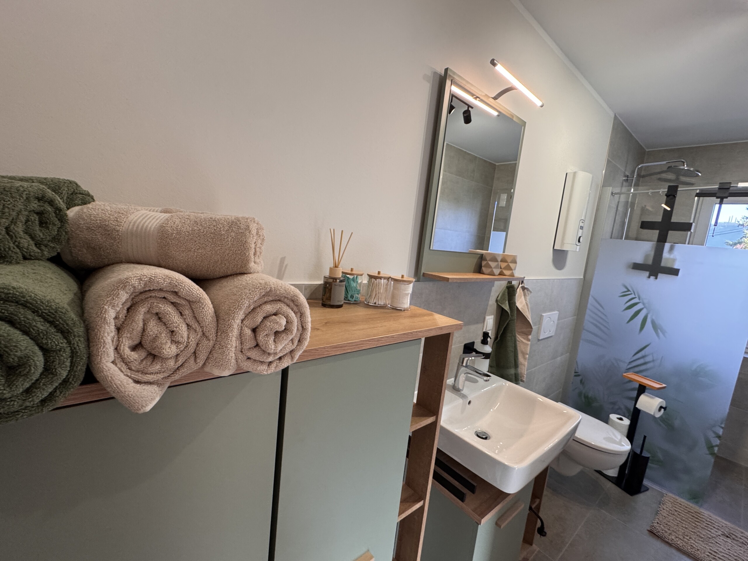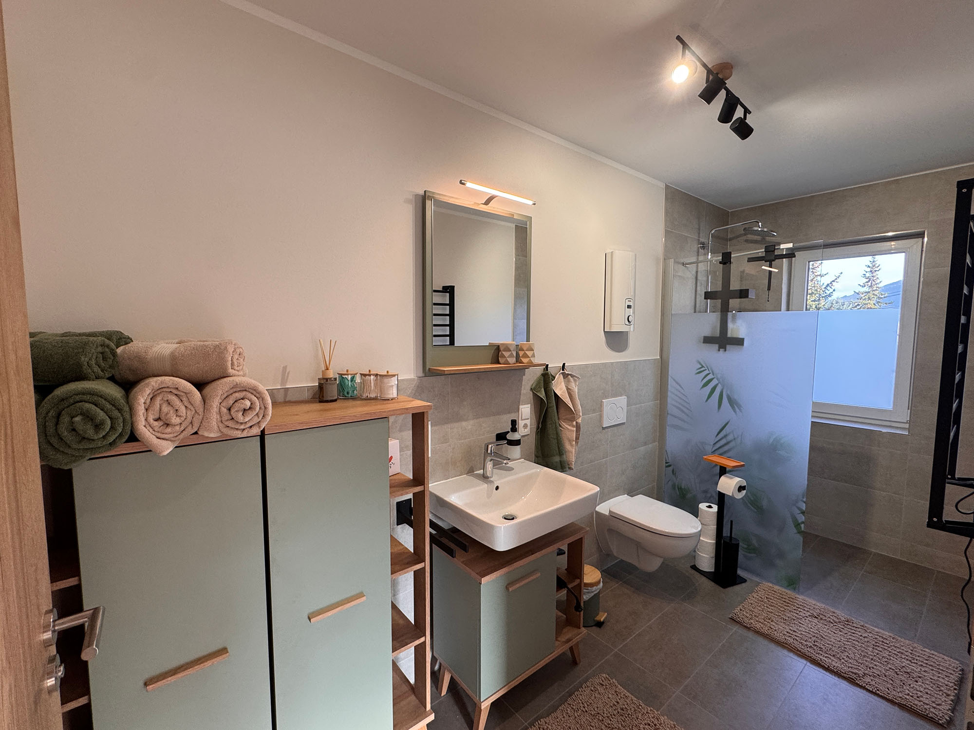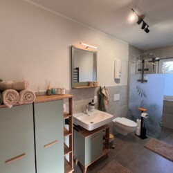 Im Bad erwartet Sie ein Ort zum Durchatmen und Erfrischen. Eine großzügige Regendusche, flauschige Handtücher und ausgewählte Pflegeprodukte sorgen für einen angenehmen Start in den Tag oder einen entspannten Ausklang am Abend. Kleine Details und eine hochwertige Ausstattung machen auch diesen Raum zu einem Teil Ihres Wohlfühlaufenthalts